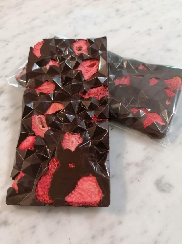 Prémium, 55%-os kakaótartalmú étcsokoládé, liofilizált eperrel, 100% természetes alapanyagokból. Gluténmentes, kézzel készített finomság. Összetétel: étcsokoládé (kakaómassza, cukor, kakaóvaj, emulgeálószer: szójalecitin, természetes vanília), liofilizált eper