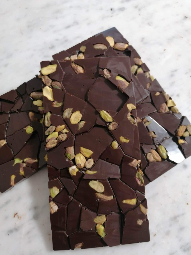 Prémium, 55%-os kakaótartalmú étcsokoládé, pörkölt pisztáciával, 100% természetes alapanyagokból. Gluténmentes, kézzel készített finomság. Összetétel: étcsokoládé (kakaómassza, cukor, kakaóvaj, emulgeálószer: szójalecitin, természetes vanília), pörkölt pisztácia