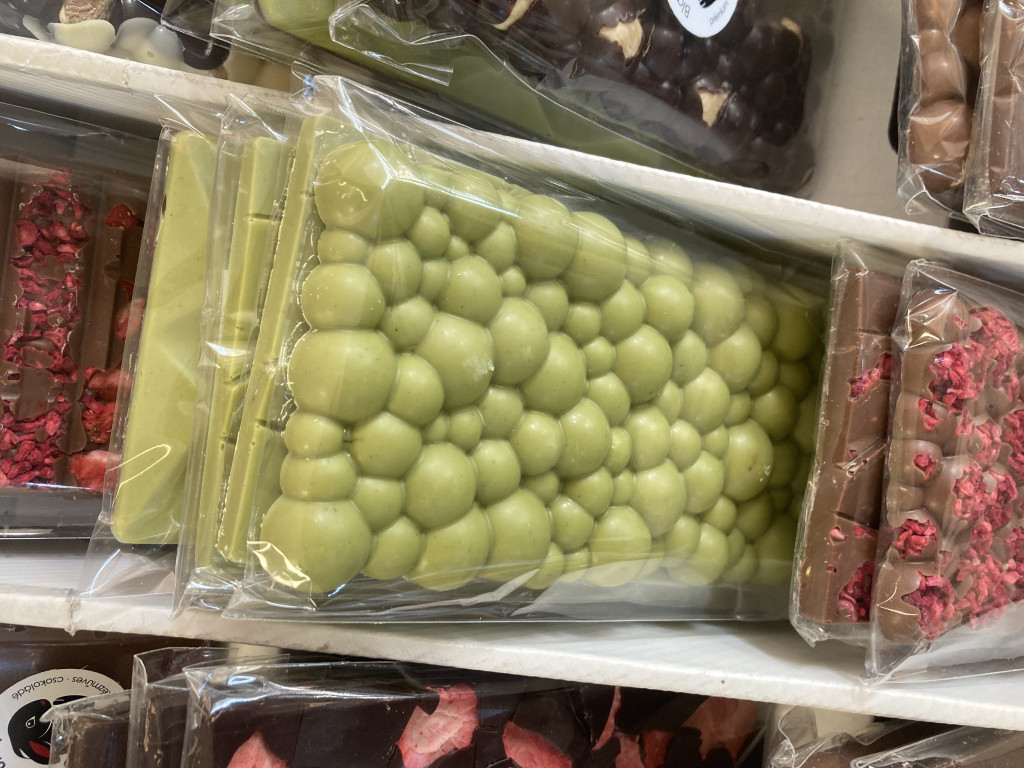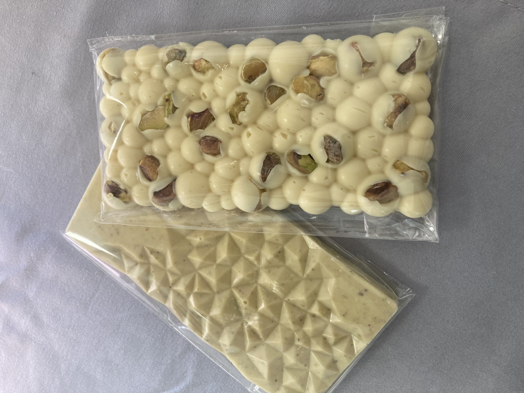 Prémium fehércsokoládé, 100%-os pörkölt pisztácia pasztával, 100% természetes alapanyagokból. Gluténmentes, kézzel készített finomság. Összetétel: fehércsokoládé (cukor, kakaóvaj, tejpor, emulgeálószer: szójalecitin, természetes vanília), pisztácia paszta (100% pörkölt pisztácia)