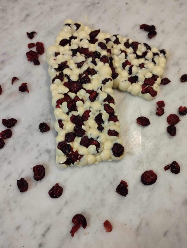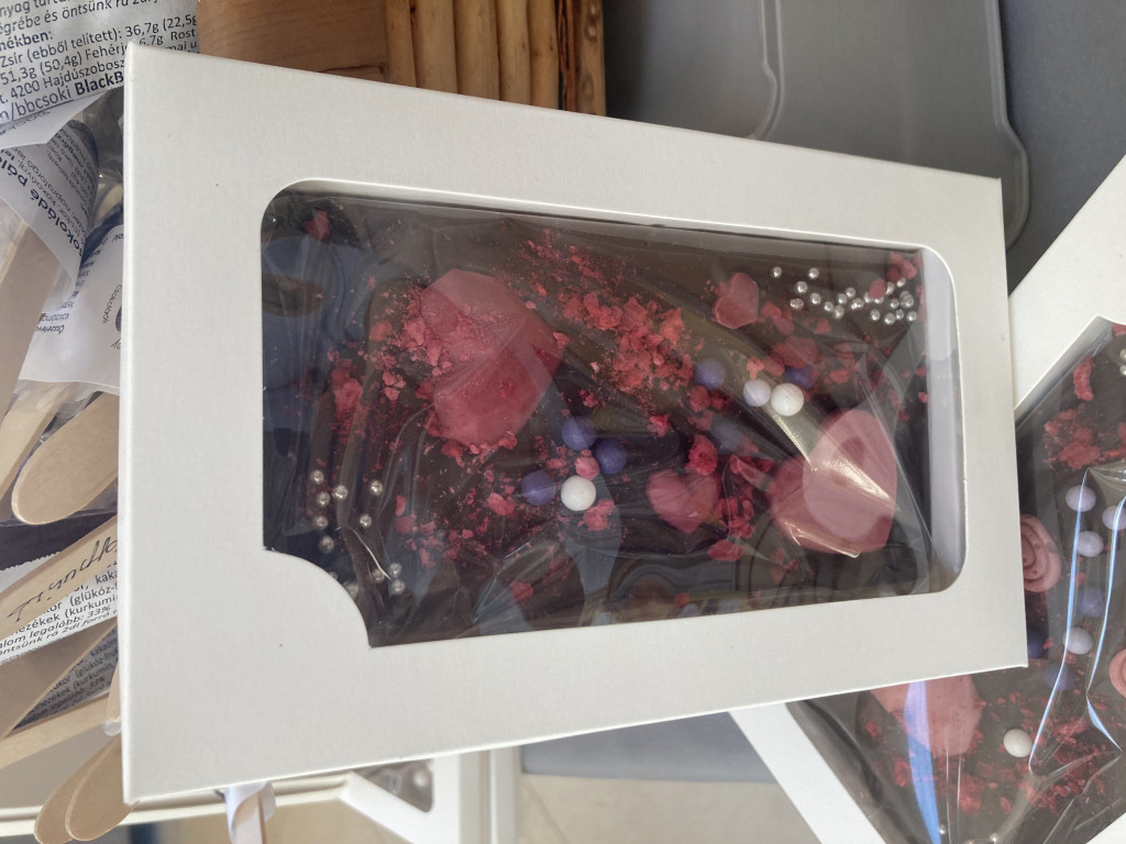 Prémium fehércsokoládé, csokidíszekkel, liofilizált gyümölcsökkel és cukorgyönggyel díszítve - egyedi, kézzel készített finomság. Összetétel: fehércsokoládé (cukor, kakaóvaj, tejpor, emulgeálószer: szójalecitin, természetes vanília), liofilizált eper, liofilizált málna, cukorgyöngy (puffasztott rizs, cukor, kukoricakeményítő, színezék: E102, E122, E170, E174, búzaliszt, glükóz, pálmaolaj, rizsliszt, maltodextrin, gumiarábikum, fényezőszer: E904, növényi olaj)
